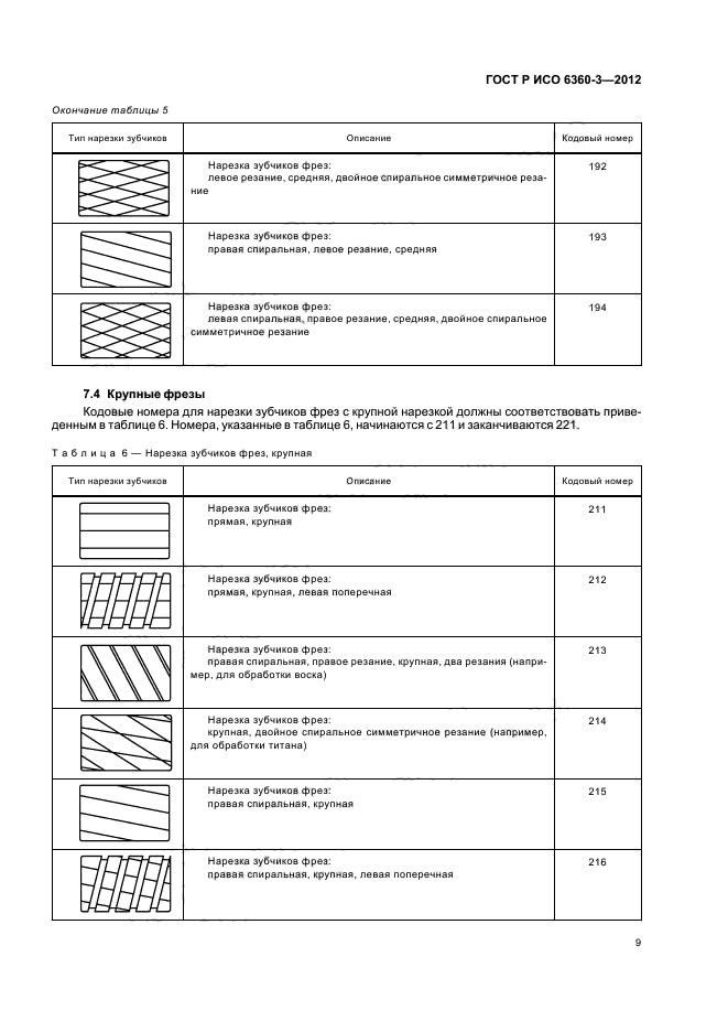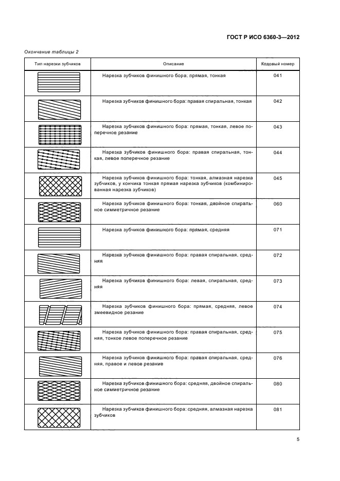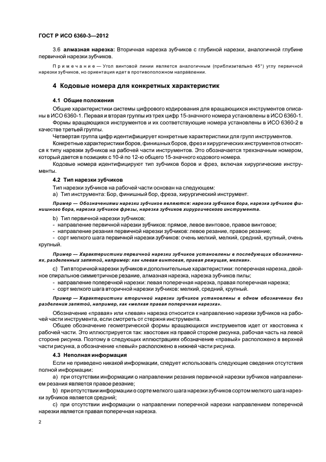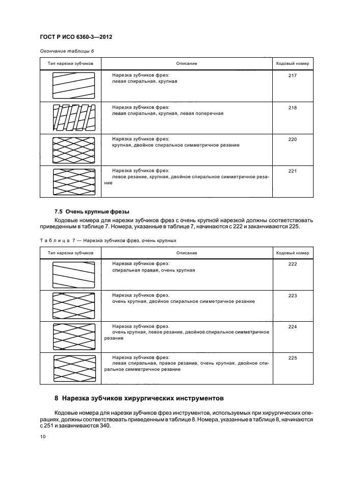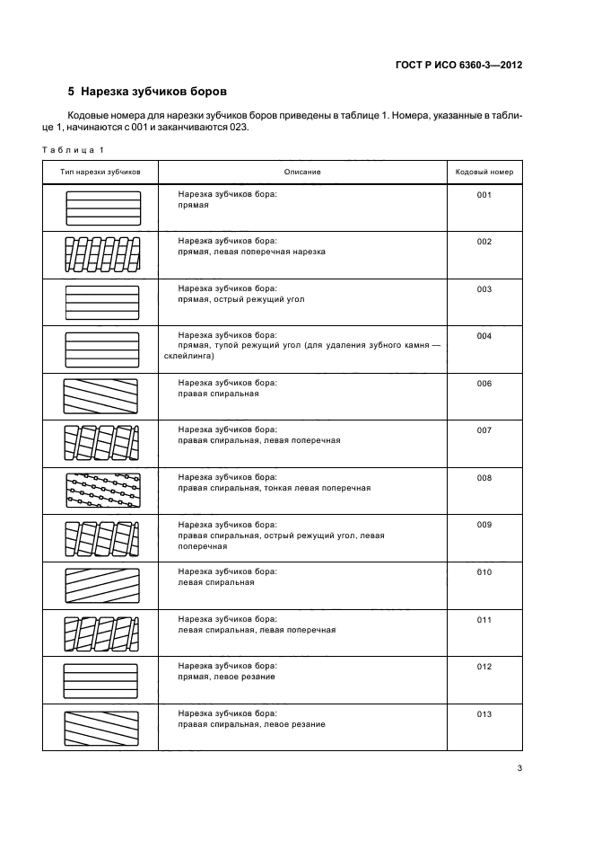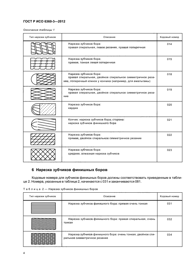Настоящий стандарт устанавливает кодовые номера для конкретных характеристик боров, финишных боров, фрез и хирургических инструментов, которые относятся к типу нарезки зубчиков на рабочей части инструмента. Этот трехзначный номер занимает позиции с 10-й по 12-ю в 15-значном полном номере и образует четвертую группу из трех цифр, принципы которой разъяснены в ИСО 6360-1 и ИСО 6360-2