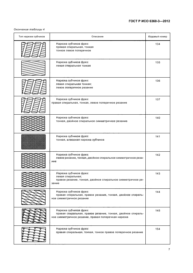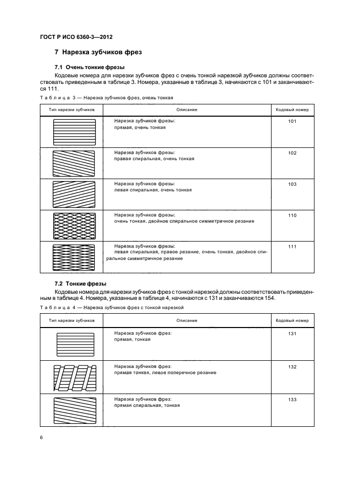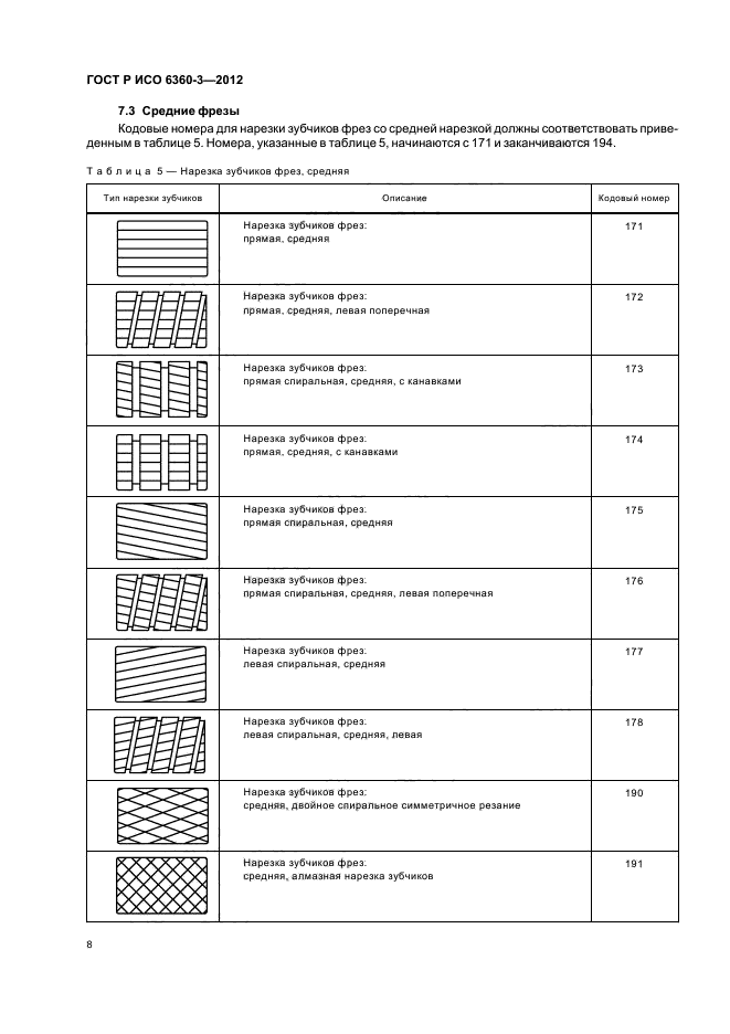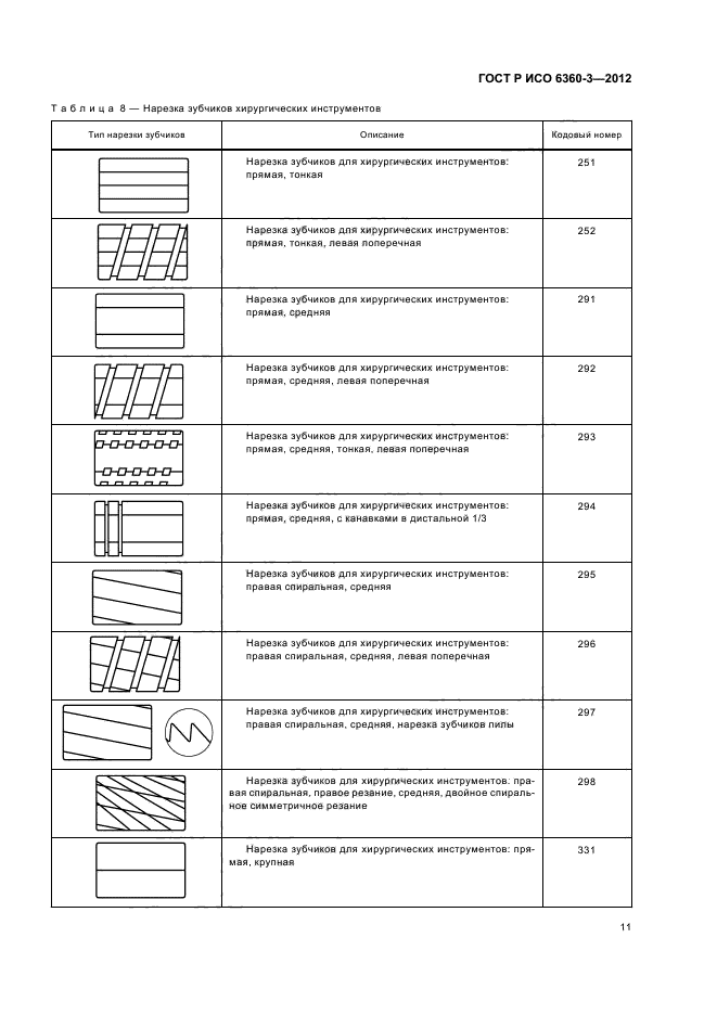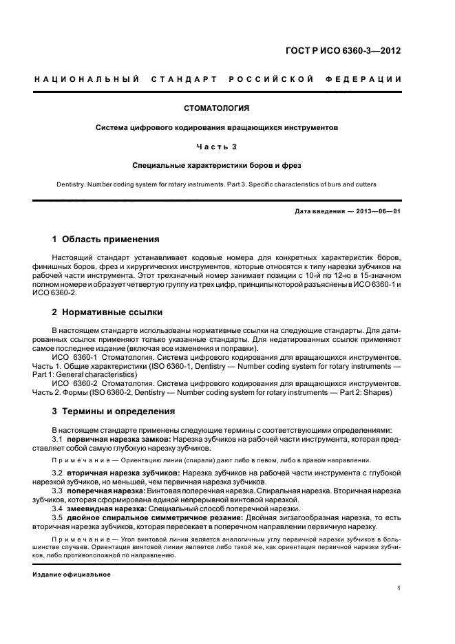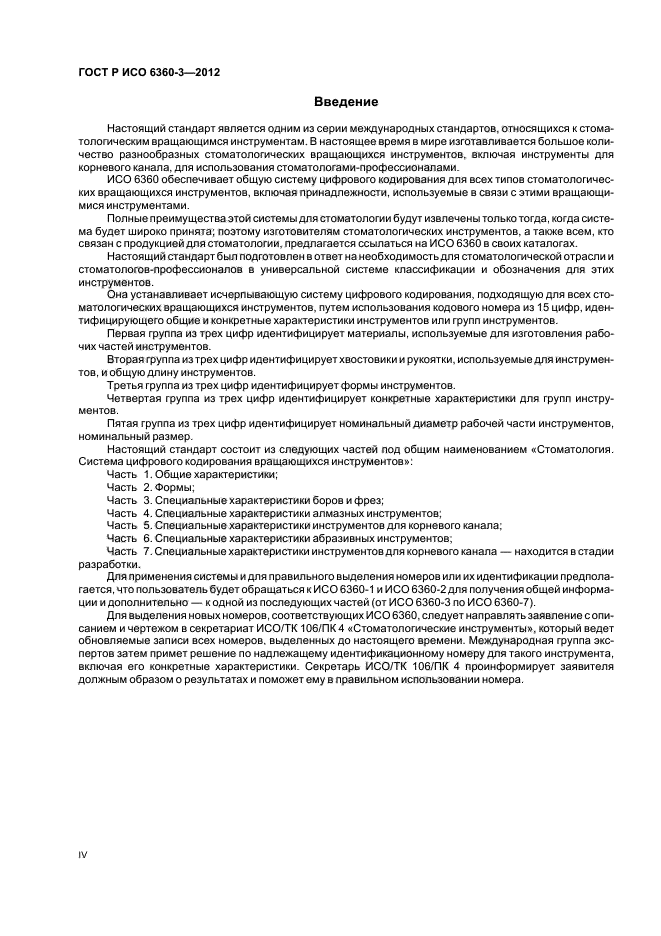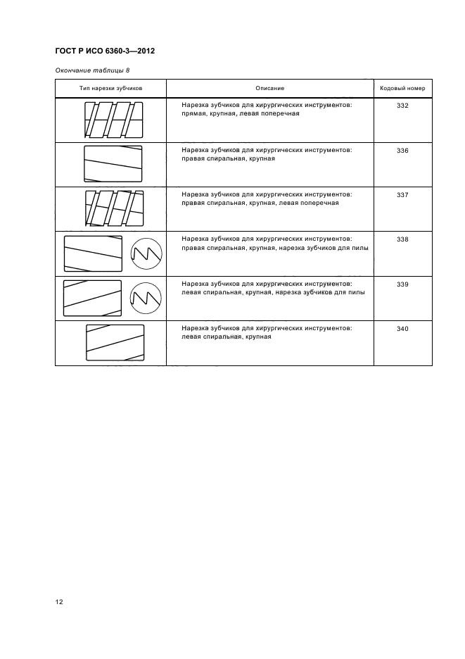 Настоящий стандарт устанавливает кодовые номера для конкретных характеристик боров, финишных боров, фрез и хирургических инструментов, которые относятся к типу нарезки зубчиков на рабочей части инструмента. Этот трехзначный номер занимает позиции с 10-й по 12-ю в 15-значном полном номере и образует четвертую группу из трех цифр, принципы которой разъяснены в ИСО 6360-1 и ИСО 6360-2
