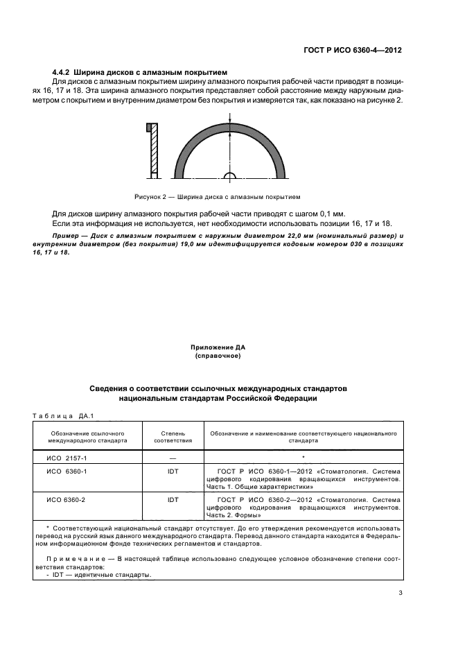 В настоящем стандарте приведены кодовые номера для конкретных характеристик вращающихся алмазных инструментов и дисков с алмазным покрытием, используемых в стоматологии. Этот трехзначный номер образует четвертую группу из трех знаков в 15-значном общем номере, принципы которого разъяснены в ИСО 6360-1 и ИСО 6360-2.