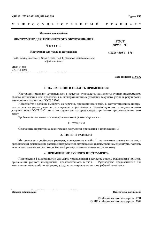 | Название на англ.: | Earthing-caving machinery. Service tools. Part 1. Common maintenance and adjustмent tools |