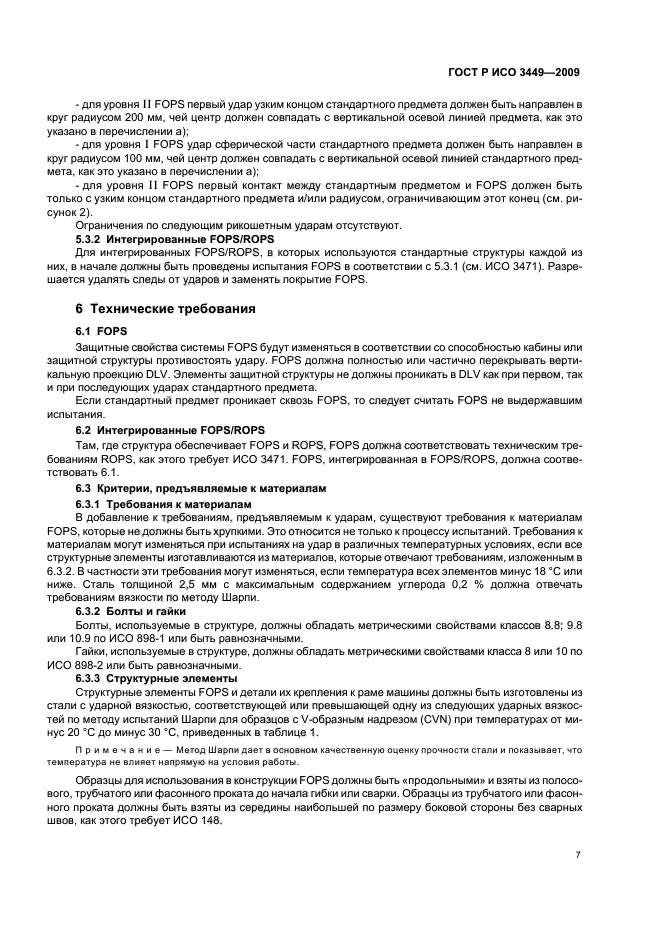 Настоящий стандарт применим для двух вариантов конструктивного исполнения FOPS как интегрированной части машины, так и в качестве дополнения к конструкции машины. Он не предназначен для FOPS машин, таких как уплотнители отходов, экскаваторы, катки, траншейные экскаваторы, трубоукладчики, для машин с дополнительным сиденьем около рабочего органа (например, обратной лопаты) или для машин мощностью менее 15 кВт
