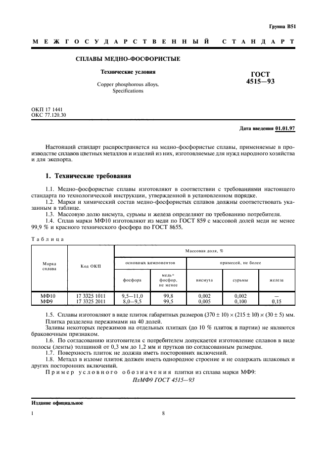 | Название на англ.: | Copper phosphorous alloys. Specifications |